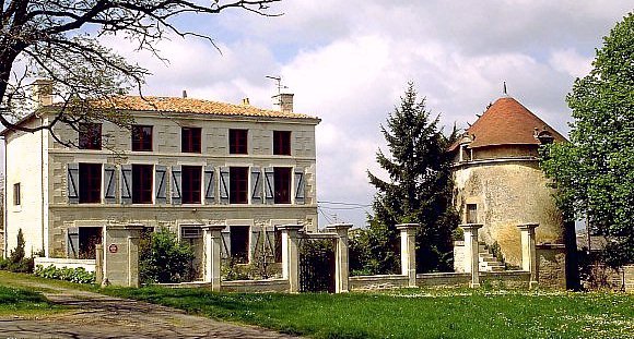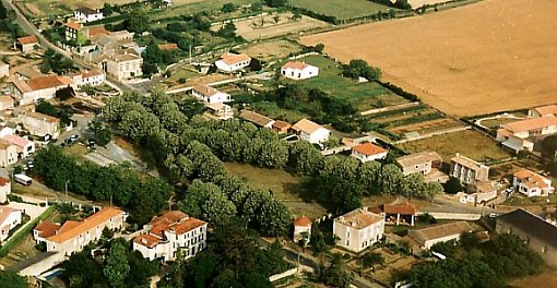 La Place du Champ de Foire, aujourd'hui plantée de nombreux tilleuls et accacias, est encore entourée de demeures bourgeoises, autrefois occupées par des commerçants, éleveurs, ou autres acteurs des foires. Elle était également entourée, principalement dans sa partie Est (à gauche) de cinq ou six auberges, qui accueillaient les chalands du grand sud-ouest ou d'Espagne. Aujourd'hui s'y tiennent les principales manifestations locales. Dans le coin inférieur droit, on aperçoit la salle des fêtes, ancien temple protestant qui témoigne de l'importance locale de cette religion. ![]()